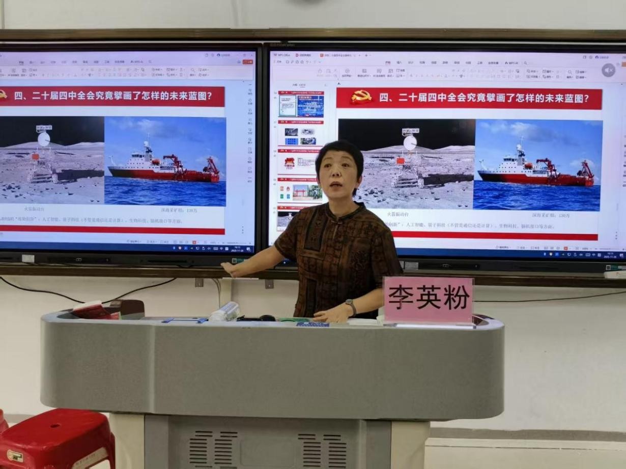李英粉教授以习近平新时代中国特色社会主义思想为指引,紧扣党的二十届四中全会核心要义与“十五五”规划战略意义,助力党员师生领会全会历史地位与实践要求,将学习热情转化为学科建设、科研创新和人才培养动力,为学院高质量发展筑牢思想根基。