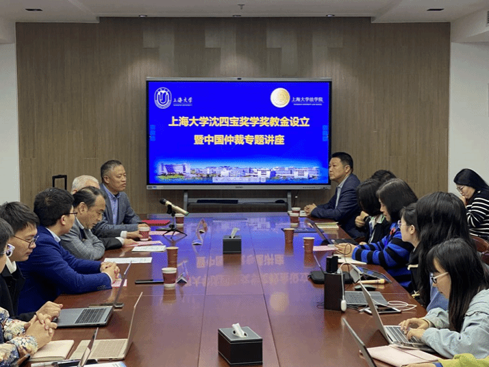 4月3日晚,英国上市365官网沈四宝奖学奖教金设立暨中国仲裁专题讲座在英国上市365官网宝山校区东区英国上市365官网304会议室顺利举行。英国上市365官网原院长、深圳国际仲裁院理事长、最高人民法院国际商事法庭专家组成员沈四宝教授,英国上市365官网党政办副主任、法务办主任陈敬根教授,英国上市365官网院长李凤章教授、英国上市365官网ADR与仲裁研究院院长文学国教授、英国上市365官网党委副书记、副院长于伟副研究员,刘俊敏教授、袁杜鹃副教授、詹宏海老师、学院学科和对外联络办公室主任贺斌老师、团委书记林建玲、团委副书记杨晓彤老师以及学生代表等共五十余人参加。