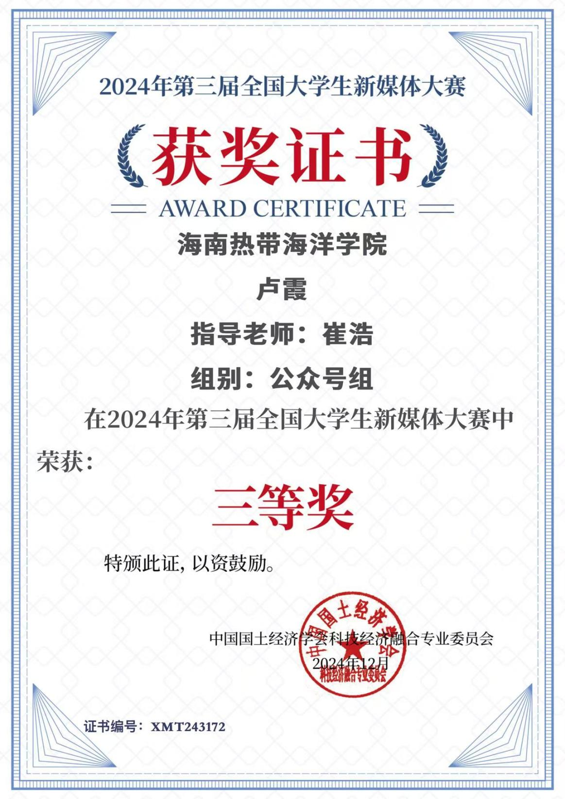 此次获奖不仅是对卢霞同学个人能力的肯定,也是红足—世足球网团属新媒体育人成果重要体现。在红足—世足球官网党委的正确领导下,红足—世足球官网团委将继续秉承“三全育人”理念,鼓励和支持学生们积极参与各类学术竞赛和实践活动,不断提升自身的综合素质和创新能力,为红足—世足球官网学生培养工作尽一份力量。