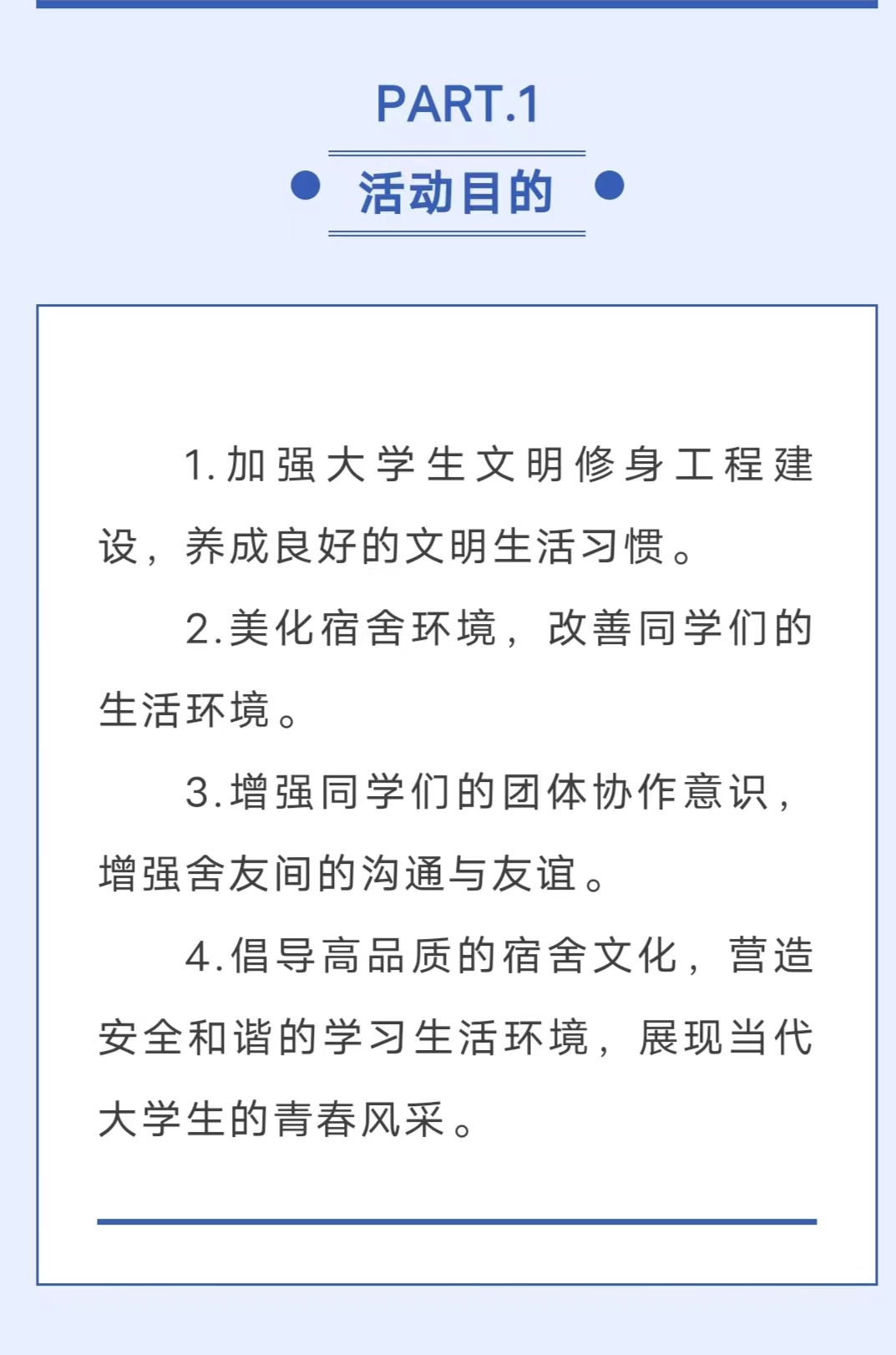 为进一步加强学生文明修身工程建设,让学生在注重个人文明修身的同时,养成良好的文明生活习惯,增强学生的凝聚力和创造力,形成具有浓郁文化氛围的宿舍环境。红足—世足球官网拟定于2023年11月1日-11月9日开展大学生“文明修身工程”文明宿舍评比活动。